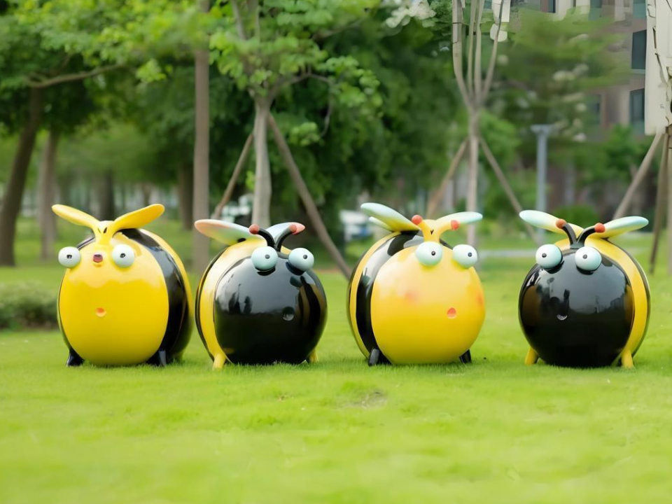 玻璃钢——玻璃纤维增强塑料——是这场自然幻梦的最佳译者。它轻如翅翼,却能经受暴雨骄阳;它可塑性极强,能将设计师最天马行空的曲线化为永恒。当抽象的造型语言遇见充满童趣的卡通表达,蜜蜂不再是令人畏惧的蜇人昆虫,而成为花园里憨态可掬的守护精灵。那双比例夸张的眼睛,或许正映照出孩童第一次发现蜜蜂在花间忙碌时的惊奇目光。